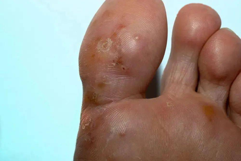 间擦糜烂型:最常见于 3~4 和 4~5 脚趾间,皮肤表面浸渍发白,深处有红色糜烂面,有时会有少量液体渗出,和「水疱型」一样有瘙痒感。